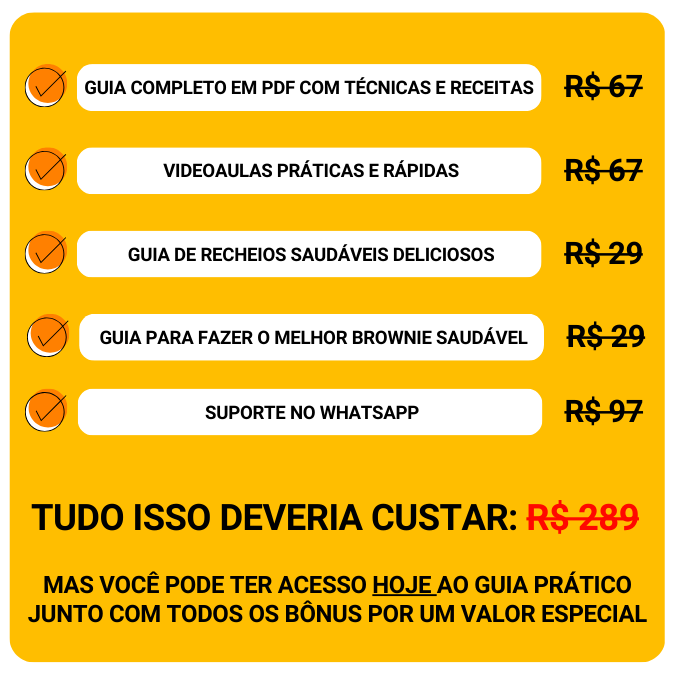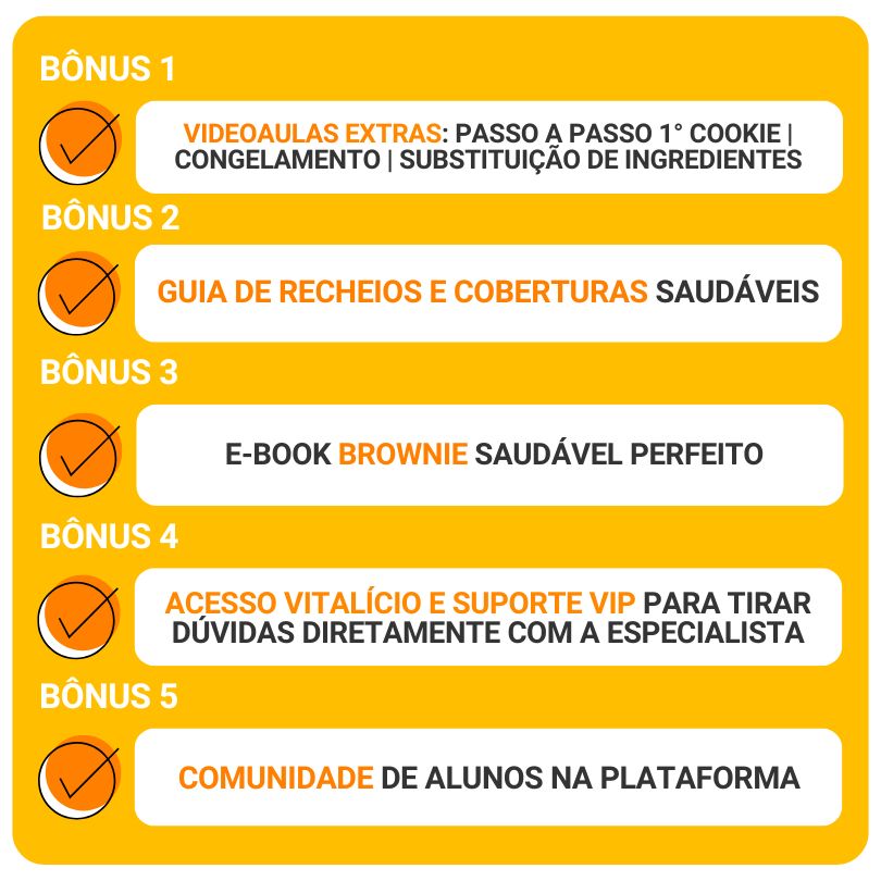 Com o mesmo GUIA PRÁTICO já utilizado e aprovado por mais de 3 mil alunas, aprenda técnicas infalíveis e receitas testadas para preparar cookies e biscoitos saudáveis verdadeiramente irresistíveis ainda HOJE. Participe do DESAFIO “MEU 1° COOKIE SAUDÁVEL PERFEITO”, que tem dentro do material, e surpreenda-se com o que você será capaz de fazer com poucos ingredientes e nosso passo a passo!